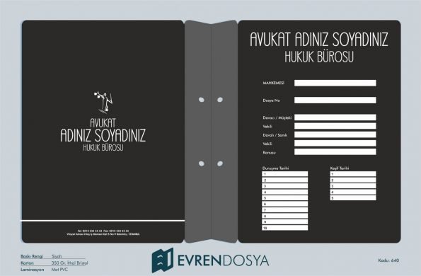 Siyah ve şık bir avukat dosya örneği istiyorsanız Avukat Dosyası 640 tam size göre. Çünkü hem siyahın verdiği asillik kurumsallık, hem de üzerindeki bilgi alanlarının kullanışlılığı mevcuttur.